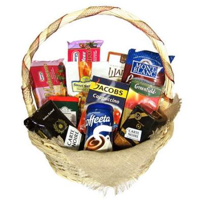 В корзине: кофе, плиточный шоколад, чай, печенье, зефир в шоколаде.