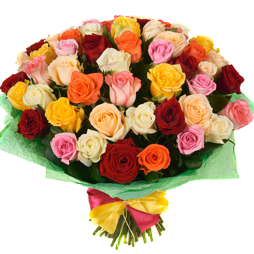 Букет состоит из MIX из 51 желтой / красной / кремовой / белой / розовой и коралловой розы, красивая упаковка.